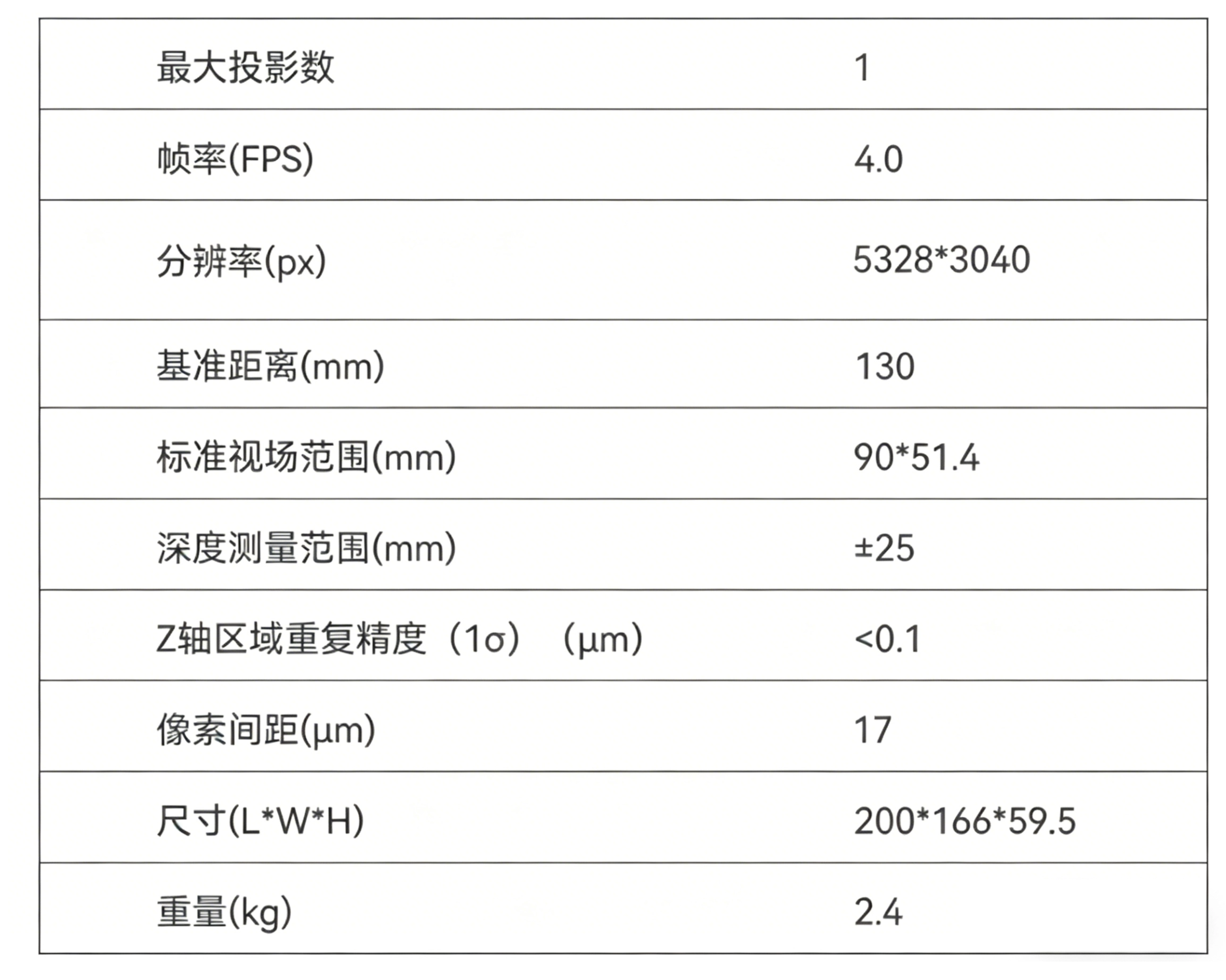 面向尺寸测量、外观检测和3D定位引导等应用场景的高性能结构光3D相机,采用了成熟的投影光学架构设计,结合正交条纹编码投影技术,消除投影盲区影响,显著提高三维重建稳定性和数据完整性;搭载创新的重建算法,能够同时补偿成像镜头和投影镜头的畸变误差,实现微米级的测量精度和亚微米级的重复精度。