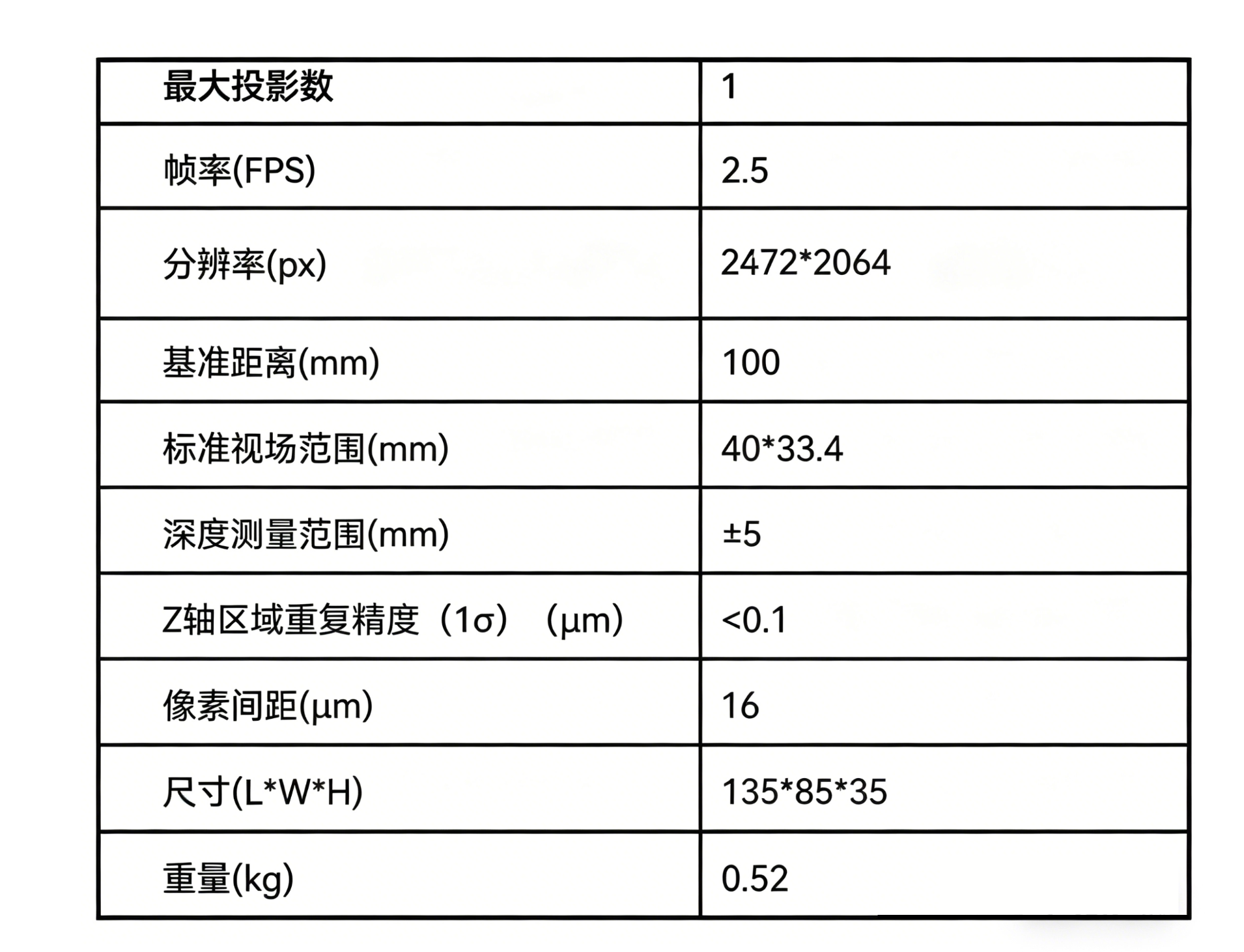面向尺寸测量、外观检测和3D定位引导等应用场景的高性能结构光3D相机,采用了成熟的投影光学架构设计,结合正交条纹编码投影技术,消除投影盲区影响,显著提高三维重建稳定性和数据完整性;搭载创新的重建算法,能够同时补偿成像镜头和投影镜头的畸变误差,实现微米级的测量精度和亚微米级的重复精度。